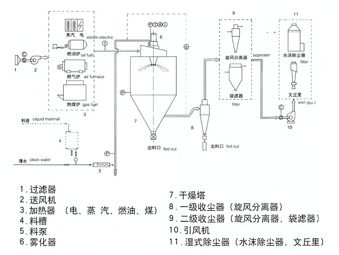 空氣通過過濾器和加熱器,進入干燥塔頂部的空氣分配器,然后呈螺旋狀均勻進入干燥室。料液由料液和熱空氣并流接觸,水份迅速蒸發,在極短的時間內干燥為成品。成品由干燥塔底部和旋風分離器排出,廢氣由風機排出。