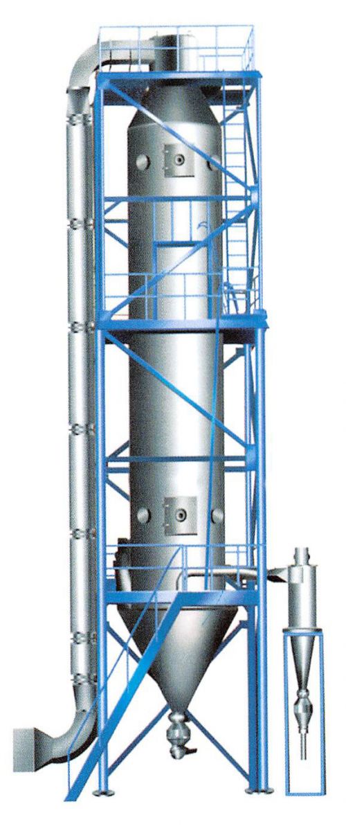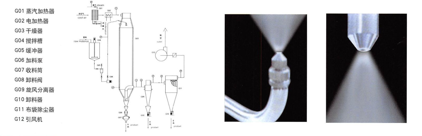 本機組工作過程中為:料液通過供料泵均勻輸入,噴出由壓縮空氣霧化成霧狀液滴,然后同熱空氣并流下降,大部分粉粒由塔底排料口收集,廢氣及其微小粉末經(jīng)旋風(fēng)分離器分離,廢氣由排風(fēng)機排出,粉末由設(shè)在旋風(fēng)分離器下端的收粉筒收集,風(fēng)機出口處還可裝備二級裝置,回收率在96-98%以上。