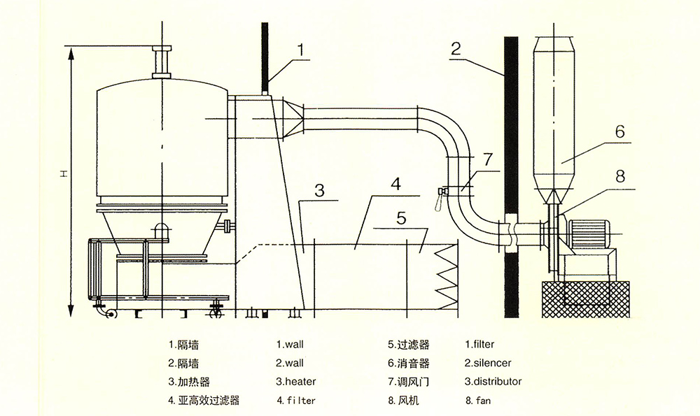 ※ 空氣經加熱凈化后,由引風機從下部導入,穿過料斗的孔網板,在工作室內,經攪拌和負壓作用形成流態化,水份快速蒸發后隨著排氣帶走,物料快速干燥。