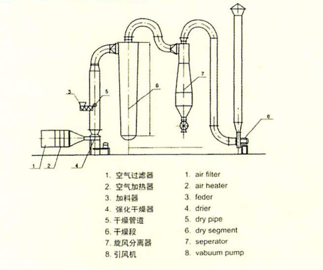 ※ 氣流干燥能從易于脫水的顆粒,粉末狀物料迅速除去水份(主要是表面水分),在氣流干燥中由于物料在干器內(nèi)停留的時間短,使干燥成品的品質(zhì)得到最佳的控制。我廠強(qiáng)化型氣流干燥是在基本型上增加一套轉(zhuǎn)速可以無限調(diào)節(jié)的強(qiáng)化器組成,濕物料通過螺旋加料器進(jìn)入強(qiáng)化器后和熱氣流充分混合,在飛速旋轉(zhuǎn)的擊刀擊碎和推進(jìn)下,物料被破碎成細(xì)顆粒,在干燥同時向出口移動,最后在風(fēng)力吸引下進(jìn)入干燥管,進(jìn)一步均勻干燥。風(fēng)力無法吸引的濕重顆粒繼續(xù)被擊碎、干燥.直至能被風(fēng)吸起進(jìn)入干燥管。