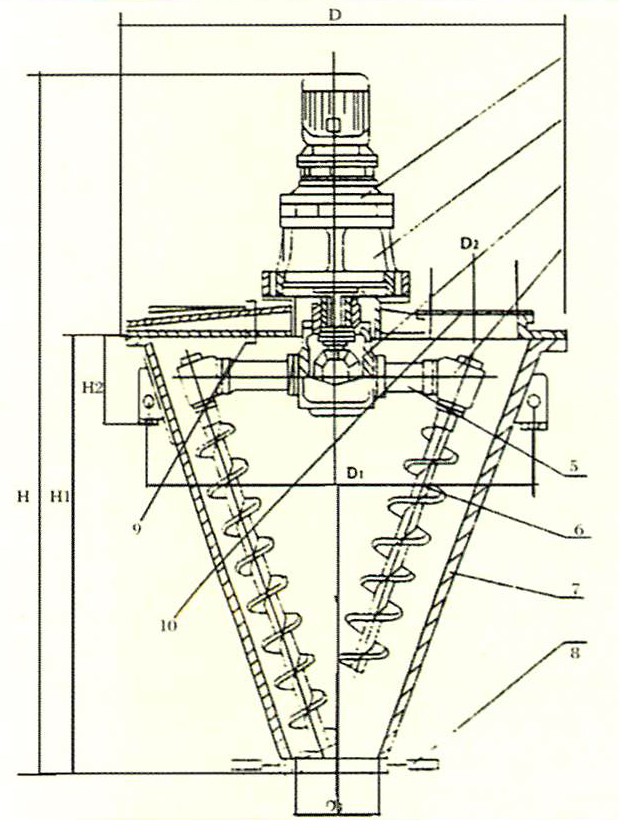 (1)、螺旋沿壁公轉(zhuǎn),使物料沿錐壁作圓周運(yùn)動(dòng);